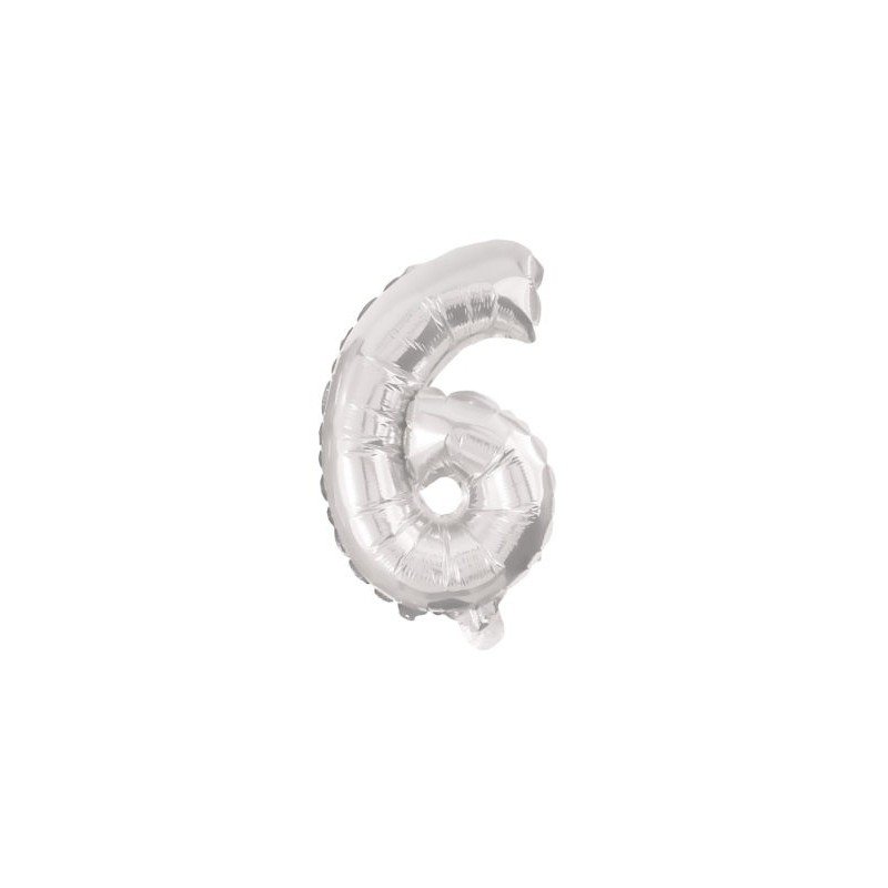 Globo de foil "Número 6" en color plata. Este globo mide 85cm y es apto para ser inflado tanto con aire como con helio. Incluye pajita